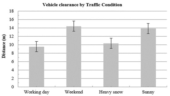 In contrast, working and heavy snow days resulted in the lowest and second-lowest average vehicle clearance, respectively; vehicle clearance can affect accident risk [34]. In general, the number of injury crashes will be higher when the vehicle clearance is small compared toa large distance. Some studies have indicated an increase in the number of crashes with a small vehicle clearance because vehicles with a small vehicle clearance always have insufficient safety distance to brake in case of an emergency.