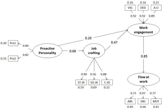 Results of sequential mediation model with standardized parameters. Notes: Only significant parameters were graphically represented. Pro1 and Pro 2 = Parcels of proactive personality; ST-JR = Structural job resources; SO-JR = Social job resources; C-JD = Challenging job demands; ST-JR, SO-JR and C-JD = Dimensions of job crafting; VIG = Vigor at work; DED = Dedication; A-U = Absorption UWES; VIG, DED and A-U = Dimensions of Work Engagement; ABS = Absorption; ENJ = Enjoyment; MOT = Intrinsic motivation; ABS, ENJ and MOT = Dimensions of flow at work.