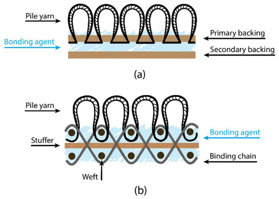 The basic structure of carpet for a tufted model (a) and a woven model (b).