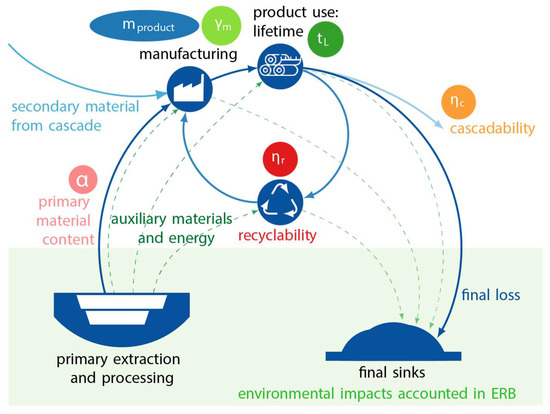 The RP method provides the designer with a tool allowing, at the same time, the reduction of the pressure on primary resources and the maximization of the utility of materials. As shown in Figure 2, the RP of a product depends on ERBs, together with product design parameters such as its mass (mproduct), manufacturing losses (γm), product lifetime (tL), primary material content (α’), recyclability (ηr) and cascadability (ηc). Those factors represent the essential elements for the calculation of the RP, according to Equation (1).