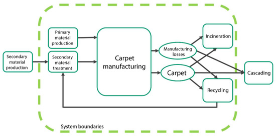 For both methods (i.e., RP and LCA), the functional unit (FU) is equal to 500 m2 of commercial floor covering, having a lifespan of 10 years. The system boundaries for the LCA are defined as “cradle-to-grave”, referring to the carpet product system only, thus using the cut-off approach for secondary resources (Figure 3). This means that secondary material inputs enter the product system burden-free, i.e., without the environmental burdens related to their primary material production. Impacts for secondary materials are counted only in terms of their processing for the specific application. On the other hand, primary material inputs are evaluated, including the environmental impacts of raw material extraction. Environmental impacts for EoL treatment are considered for any processes that involve the carpet product system only; thus, this represents either incineration or recycling. Cascading and the cascaded product system are not included in the simplified carpet LCA.