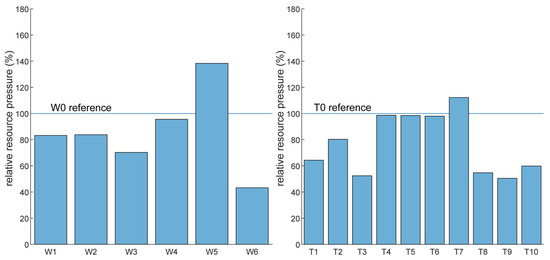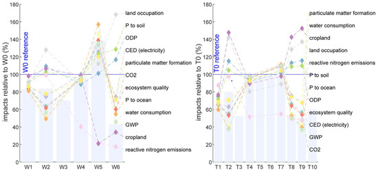 In contrast, those results related to the other impact categories, i.e., P to the soil, reactive nitrogen (N) emissions, ODP, land occupation, and cropland use, show inversely correlated or uncorrelated results. For example, the LCA results for CO2 emissions, GWP, CED, ecosystem quality, water consumption, particulate matter formation, and the addition of P to the ocean of scenarios W6 and T8–9 follow the RP results; however, for the impact categories of P to the soil, ODP, land occupation and cropland, impacts are even worse than the reference products (W0 and T0). This is because, in the ERP calculation, the most pressing environmental category becomes limiting for each resource, which, in most cases, is CO2. As such, any impact category correlated with the limiting boundary can be predicted well, while others are not. This is, however, not a problem, as the most limiting boundary category is identified in the ERP procedure.