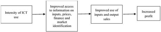 It is hypothesized that intensively using ICT tools in agriculture improves farmers’ access to information on inputs, prices, finance, and market identification through Agricultural Information Systems (AIS), networking, and virtual markets. This eventually leads to improved usage of inputs and output sales (Figure 2). This framework is backed by Saidu, Clarkson, Suleiman, Muhammed, and Joibo [14], who argue that entrepreneurs can increase production and sell more products to potential buyers and enhance effective management of sales as well as minimize direct and indirect costs, particularly advertisement cost and at the same time improve business process. Additionally, Kale, Rohilla, Meena, and Wadkar [15] believe that ICT provides timely information on what, when, where, why, and how to produce and sell agricultural products. Informed by this body of literature, this study investigates the relationship between the intensity of ICT use and increased profit.