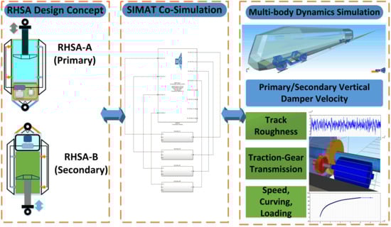 A vehicle–track coupled dynamics model considering the vehicle and regenerative damper interaction was developed to predict the power potential and power regeneration according to the multibody dynamics and the mechanical–hydraulic–electromagnetic coupling mechanism for a typical high-speed train. The cosimulations were carried out under various running conditions (curved track, track irregularity, speed profile, traction profile, and carbody loading conditions) to analytically characterise the proposed regenerative damper and compare the power capability of the vertical dampers of a high-speed train. As shown in Figure 1, SIMPACK scripting and MATLAB scripts were used to automate the analysis process. The automation generated a simulation run with the required vehicle–damper model and simulation parameters, and then began the cosimulation.
