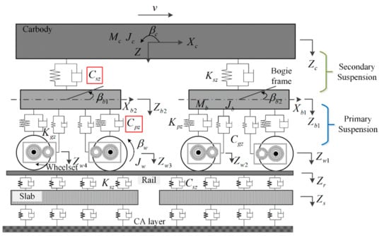 In the above equation, when i = 1,2, n = 1; and when i = 3,4, n = 2. In addition, the subscripts of the motion variables X, Y, Z, φ, ψ, and β are explained as follows: c—carbody; b—bogie frame; m—traction motor; g—gearbox; w—wheel; a—axle box; L—left; and R—right. One dot above the variables represents a first-order differential operation. Furthermore, the details of the motion variables are shown in Table 1. The present vehicle-track model was validated through a comparison with the measured accelerations of a carbody collected from field tests in the authors’ previous works [44,48].