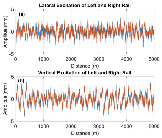 The approach to representing track irregularities adopted in this work was based on power spectral density (PSD), a method developed by the Federal Railroad Administration (FRA) of the U.S. Dept. of Transportation that is based on a large amount of measurement data. Relating to the track irregularity, the PSDs were analysed according to even rational functions containing cut-off frequencies and irregularity constants, with wavelengths ranging from 1.524 to 304.8 m. Six track classes were considered [49]. In general, apart from the rail irregularities, the wheel–rail interaction differed on each track due to different combinations of the curve radius, cant deficiency, and transition length. It was noted that the track design between the high and low rails (left and right curve) was assumed as identical throughout the simulation process. A track irregularity of a typical high-speed line (the measured vertical and lateral irregularity of the WG line is shown in Figure 3) was employed in the evaluation of the variable running speeds, tracks, and loading cases.