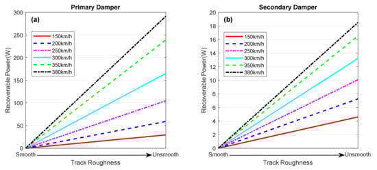 Figure 4. Average recoverable power of the HST primary and secondary dampers with variable track irregularities and running speeds. (a) Note Primary Damper; (b) Secondary Damper.