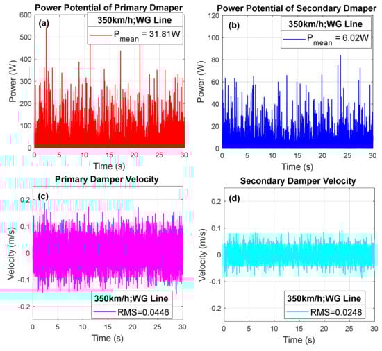 Figure 5. (a) Power potential of primary damper; (b) power potential of secondary damper; (c) primary damper velocity of the WG line at 350 km/h; (d) secondary damper velocity of the WG line at 350 km/h.