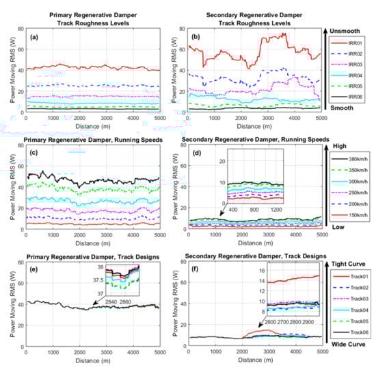 Figure 7. A general view of moving RMS power quantities of primary and secondary regenerative dampers: (a,b) Track roughness levels; (c,d) Running speeds (e,f) Curved tracks.