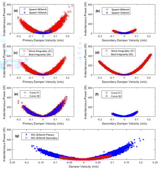 Figure 9. Damper velocity profile of the instantaneous power in case of (a,b) speed, (c,d) track irregularity, (e,f) track design, and (g) WG line for primary and secondary regenerative dampers.