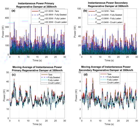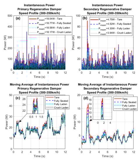Figure 11. (a,b) Instantaneous power at speed profile (300–350 km/h) for primary and secondary regenerative dampers on various loading conditions; (c,d) Moving average of instantaneous power at speed profile (300–350 km/h) for primary and secondary regenerative dampers on various loading conditions.