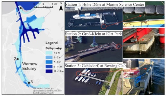 S2. IGA Park: This station is located at the IGA Park as indicated by its name. This park is located at Schmarl Dorf, known for different activities, such as open-air concerts and musical events, food exposures and even a place of attraction for swimmers and water activities performed throughout the year, etc. On the coastal part of the park, which is exposed to the Warnow River estuary, there is a platform next to the Maritime Museum which extends into the estuary for approximately 165 m. The incubators are hung at the extremity of this platform with the geographic coordinates: 54°08′27.4″ N, 12°05′21.2″ E. It is characterized by its exposure to the different currents of the Warnow River and to the sun; parameters that are important and play a role in the degradation of the materials to be tested. The water depth is around 4 m, and water clarity is not high and depends on the season. This station is also characterized by an important growth of mussels. Access is supported by the park administration.