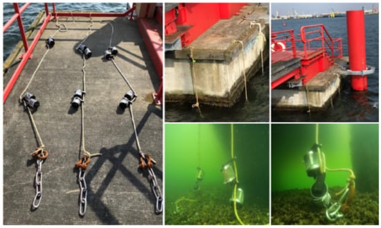Tableware items were cut into small pieces in order to fit into the incubators and were weighed and measured. For each item, a sample was placed in an upper incubator (close to the surface, more exposed to sunlight and to pelagic organisms) and in a lower one (closer to the bottom, less exposed to sunlight and to demersal organisms). In total and at each station, 12 incubators were placed in the water in 3 groups of 4 incubators and were attached to ropes. They were hung from the top and fixed with chains to the bottom as shown in Figure 4.