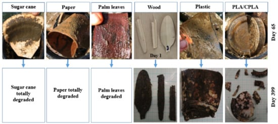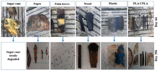 These experiences could lead to different hypotheses based on the origin of the materials, their behavior in the natural environment and to the affecting environmental changes. Regarding the PLA and CPLA as well as plastic items (in this case PS), their biodegradability in water columns does not seem to be achievable in one year. Other products (palm leaves, sugar canes, wood and paper) could be degradable after a shorter period, for the reason that this is linked to their original state and their behavior in nature.