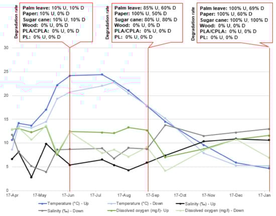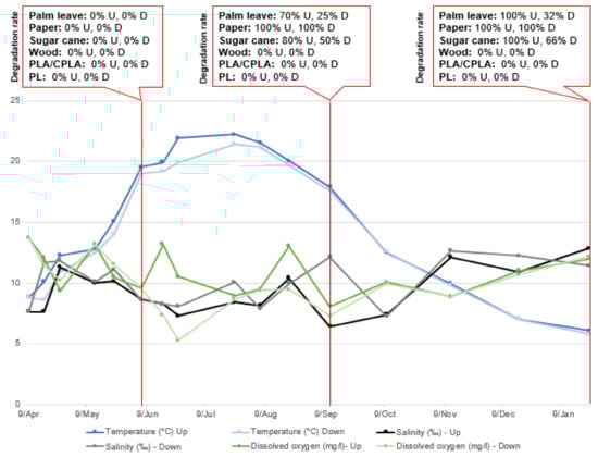 The degradation of the placed items in all stations started in June, when the temperature increased considerably. Before June, the DR was, in most cases, 0% for all tested materials, and reached higher percentages by the end of the summer period. The experimental findings showed the important role of temperature with regard to accelerating the degradation of palm leaf, sugar cane and paper, particularly in the upper incubators, where the temperature was relatively higher than in the bottom due to its greater exposure to the sun. However, the results indicate that the temperature parameter had no effects on the degradation of PLA, CPLA and PS tableware.