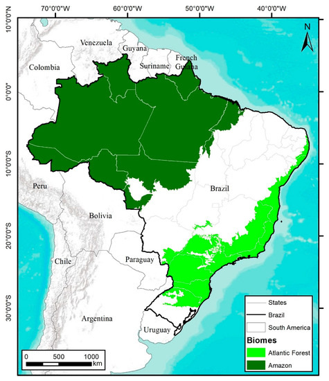 The selected study areas were the Brazilian Amazon and Atlantic Forest biomes (Figure 1). The Amazon extends to the states of Acre, Amapá, Amazonas, Pará, Rondônia, Roraima, Tocantins, Mato Grosso and Maranhão, comprising 558 municipalities and occupying an area of 5 million square kilometers. The Atlantic Forest extends from Rio Grande do Norte to Rio Grande do Sul, comprising 3082 municipalities and an area greater than 1.1 million square kilometers [35].