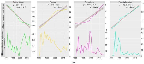 In the 2019–2020 period, native forest and pasture had total area losses of −2.42% (−0.61 Mha), while agriculture, planted forest, and agriculture and pasture mosaic grew together (3.62%) (Figure 3A,B).