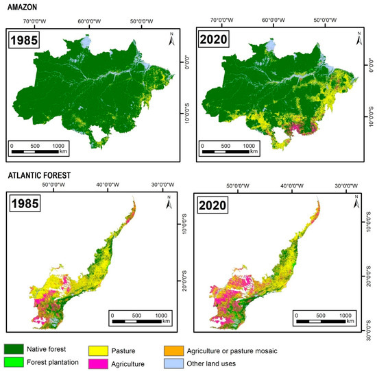 Land use and land cover observed in 1985 and 2020 in the Amazon and Atlantic Forest biomes. Land use and land cover are provided from MapBiomas [37], country and biome boundary data from IBGE [36].