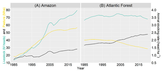In the Atlantic Forest, while the pasture area shrunk (−29% of area), the livestock increased, from 66.22 M heads (1985) to 67.88 M heads (2020), with an increase of 1.66 M heads in the pasture areas. As a result, the mean stocking rate hiked from 1.66 to 2.39 M heads per hectare of pasture (Figure 5B).