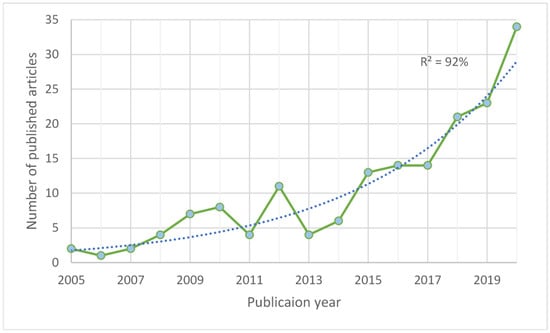 In relevance terms, the scientific production in wine tourism studies reaches an exponential growth adjusted to 92%, based on the 199 articles retrieved with a publication date between 2000–2021 (including early access documents), with an uninterrupted annual publication in a full-year registry between 2005 and 2020 (see Table S1 included in Supplementary Materials).