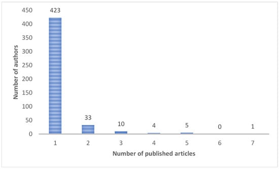 This publication set is the result of the research work of 476 authors, whose contribution to the scientific production is distributed between 1 and 7 articles, as shown in Figure 2.