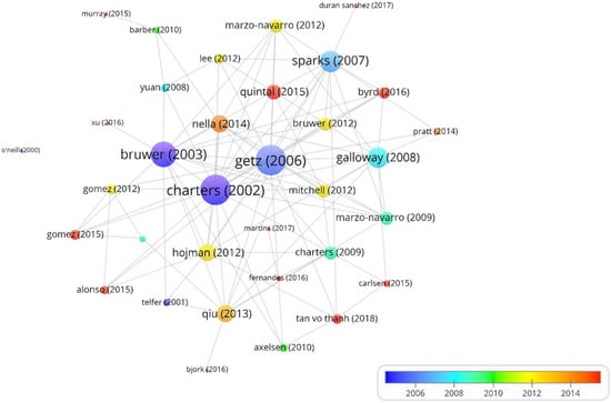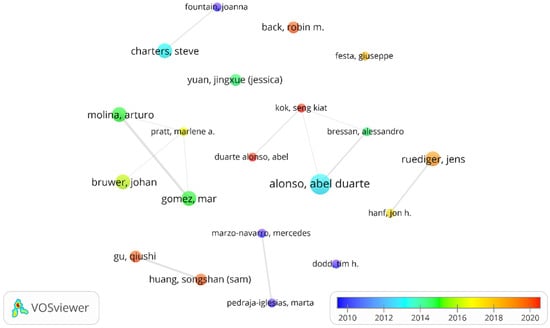 The objective of this article is to recognize the global reference authors on research in wine tourism, a growing tourism activity worldwide, which contributes to the economic development of wine regions, with the capacity to boost the economy, stimulate local development, and improve the image of a city [1,2,3,4,5,6,7,8,9,10,11]. The increasing number of articles in journals indexed in WoS databases shows that interest in wine tourism research has increased in the last decade, worldwide, especially in Australia and the United States, with a high degree of sources (journals) and authors with a single article on the subject, and it is interesting to know how this atomized topic of tourism research is constructed [5]. In such a way that it can contribute to the Sustainable Development Goals (SDGs) to promote sustained, inclusive, and sustainable economic growth, full and productive employment, and decent work for all, and to make cities and human settlements inclusive, safe, resilient, and sustainable [12]. In order to achieve the research objective, we used the bibliometric methodology, which allows us to answer questions such as: Which authors are the leading researchers on wine tourism? From which countries do these authors carry out their scientific production? Which are the articles on wine tourism most valued by the scientific community? Which wine tourism articles are the most influential for the production of other highly valued articles?