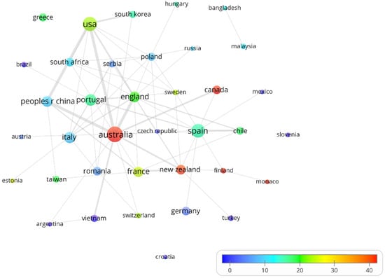 Although Table 2 shows a greater presence of affiliations located in the USA and Australia, it also highlights the existence of intercontinental work teams (e.g., Australia, Chile and Spain, and Australia, USA, and Vietnam). In general, the 199 articles present a large interaction of 32 countries (See Figure 4), with the few solo initiatives being those presented by Greece, Croatia and Slovenia, and the Bangladesh–Malaysia duo. The size of the nodes indicates the amount of scientific production from each country or territory; additionally, the colors show the valuation of the scientific production of each geographical origin, expressed in average citations of the articles where the contribution ranges from blue to red with values from 0 to 45.