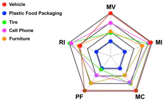 Graphical representation of characteristics: Material Variability (MV), Material Integration (MI), Material Complexity (MC), Product Form Factor (PF), and Recovery Initiatives (RI), contributing to product complexity. The centre is “0”, with concentric rings from “1” to “4” (outermost boundary).