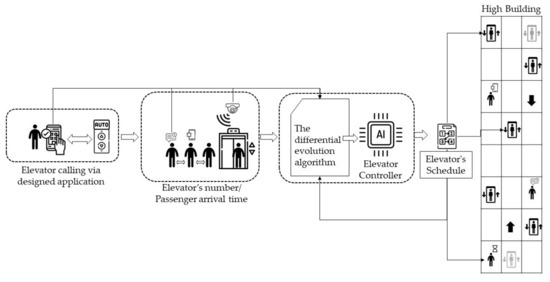 In this research, we developed a mathematical model to represent passenger and elevator scheduling in order to optimize the energy consumption of elevators using the differential evolution algorithm (DE). An application was designed to communicate between the elevator control system and the passenger in order to manage the waiting time and number of passengers waiting in the elevator’s waiting area, aiming to reduce the spread of COVID-19. Moreover, to reduce energy consumption, three elevator stopping strategies have been presented and verified.