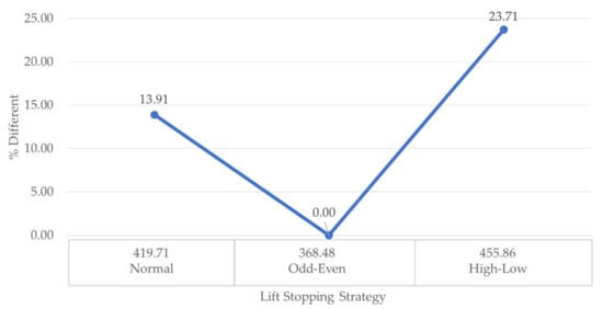 From Figure 2, we can see that using the high–low floor stop strategy generates a 23.71% higher cost than that incurred using the odd/even strategy. The odd–even strategy generates a 13.91% lower cost than when the elevator stops at every floor at which it is requested (normal strategy). The % difference in the number is calculated using Equation (21):