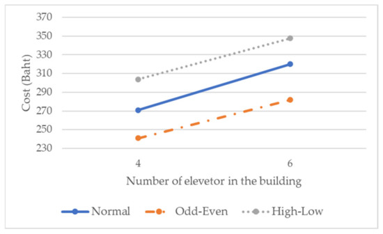 We used the results shown in Table 5 to plot a graph showing how the different stop strategies affect the total cost. These three strategies are: (1) normal (where the elevator stops at every required floor), (2) odd–even (where the elevator stops at either odd or even floors), and high–low (where the elevator stops at either high or low floors). The results of the comparison are shown in Figure 2.