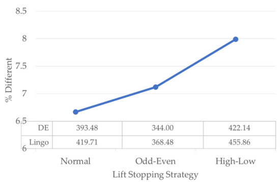 Figure 5 shows the % difference in the cost generated using different methods. These two methods use Lingo v.11 and DE. The average difference between results when using Lingo and DE is 6.67–7.99%, depending on which elevator stop strategy is used.