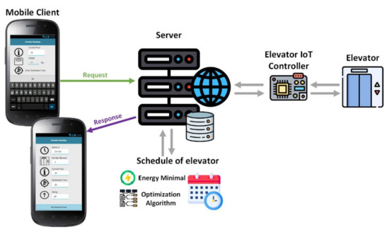 Figure 6 shows the system architecture design when the mobile client requests the server, which records the daily elevator requests of users; then, the system queries all elevator bookings to schedule the use of elevators. This system uses an optimization algorithm to ensure the minimum energy consumption of scheduling elevators, and the system relays the results of the elevator booking to each mobile client. In addition, this system also has an elevator IoT controller, which sends the elevator status information in real time via the internet to the server for mobile client response. The application runs on the Android platform. Furthermore, PHP scripts were run on the server for mobile client requests and responses. The Python script of the optimization algorithm was run each time a mobile client made an elevator booking. The elevator booking system is also installed in the touchscreen panels of kiosks at the entrances of elevator zones, to serve one-time visitors who do not have the booking system on their smartphone.