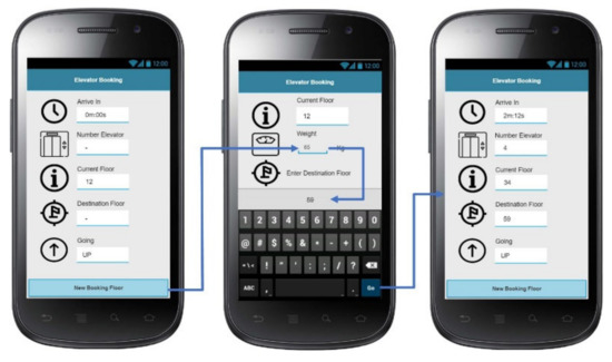 Figure 7 shows the user interface of the elevator booking design: the user clicks on “New Booking Floor” to book an elevator, and the system then asks the user to fill in their weight information and select the floor; the user then clicks “go” for confirmation. The system displays the result, the number of elevators, and elevator usage time. In addition, the current floor status of the elevator is displayed in real time.