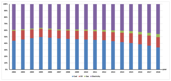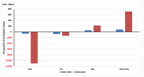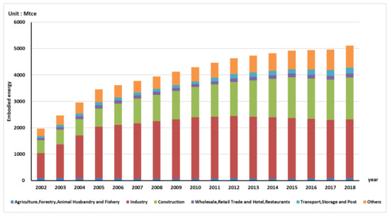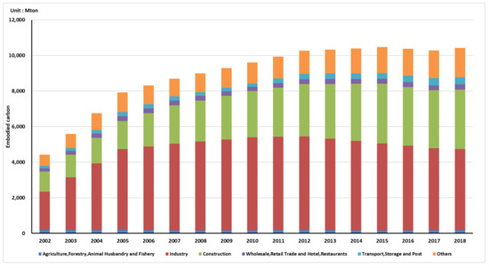 The development trend of embodied carbon was similar to that of embedded energy, but the total quantity of embodied carbon stabilized after 2012, as shown in Figure 2. The total quantity of the industry sector began to decline significantly after 2012. Compared with embedded energy, part of the difference in the development of embodied carbon was mainly due to China’s efforts to adjust its energy structure and promote renewable energy. The proportion of coal consumption in China dropped from 68.5% in 2002 to 59.0% in 2018. The proportion of coal power in electricity production also dropped from 80.9% to 71.1%. This also enabled China to maintain the stability of the total quantity of embodied carbon while the embodied energy continued to grow.