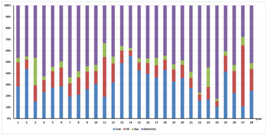 Specific to the sector level, there were obvious differences in the energy structure of different sectors’ embodied carbon, as shown in Figure 4. For example, the sectors with a high proportion of coal in embodied carbon were mainly concentrated in industry (sectors 12–20) and construction (sector 25), while the industries with the highest proportion of electricity were industry 22 (electric heating production) and industry 24 (water production). Sectors with a relatively high proportion of oil mainly included industry 11 and industry 27 (oil-related industries and transportation), while sectors with relatively high proportions of natural gas included industry 3 and industry 23 (both natural gas-related industries).