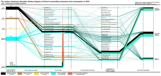 Figure 5 shows the carbon emissions allocation Sankey diagram of China in 2018. In the figure, all flows represent carbon emissions. The color of the flow indicates the energy type of the carbon emission source, and the width of the flow indicates the quantity of carbon emissions. From left to right, there are the energy sources of carbon emissions, the direct carbon emissions generated by energy consumption of each sectors, and the embodied carbon in the intermediate use of commodities flowing into the final consumption commodities of various sectors.