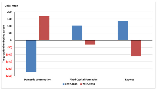 The impact of the final consumption quantity on embodied carbon in 2002–2010 and 2010–2018.