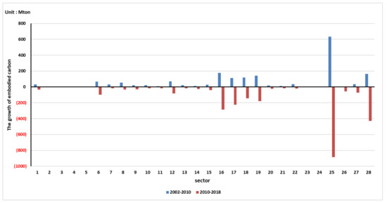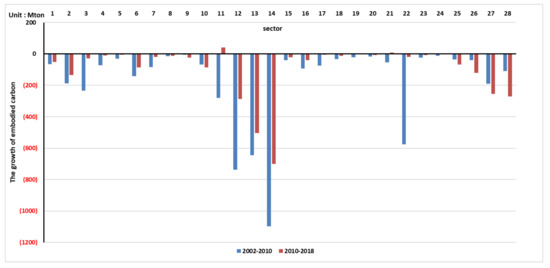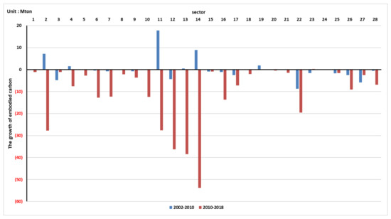 In 2002–2010 and 2010–2018, the increase in final consumption contributed 8.35 billion tons and 7.07 billion tons of embodied carbon growth, respectively, as is shown in Figure 9. In all sectors, the quantity of final consumption in most sectors increased, which led to the increase in embodied carbon. Among them, sector 25 (construction sector) had the largest increase, contributing 2.22 billion tons and 2.75 billion tons of embodied carbon in the two periods, respectively. This was followed by sector 28 (other services sector), which contributed 990 million tons and 1.46 billion tons of embodied carbon in the two periods, respectively. In the two periods, only a few sectors’ final consumptions did not increase, such as sector 2 and sector 3. Meanwhile, it should also be noted that the increase in most industrial sectors in 2010–2018 was less than the increase in 2002–2010, while the increase in the service sector in 2010–2018 was greater than the former. To a certain extent, this reflects the country’s industrial adjustment trend from manufacturing to service industries.