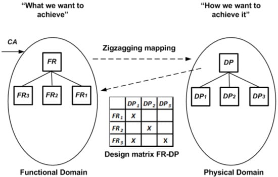 In this context, axiomatic design makes it possible to define a mapping between these two domains in terms of a design matrix (Figure 1). In this case, the “X” symbols represent the mapping between FRs and DPs and identify the constituent modules of the system [19]. For this reason, we can say that the design matrix is a particular domain mapping matrix (DMM), because it maps the relationships that exist between two domains [20]. Usually, DMMs are nxm rectangular matrices that relate the n elements of one domain to the m elements of another domain. Conversely, design matrices are always square matrices. This consideration introduces us to the most specific feature of axiomatic design, i.e., the independence axiom.