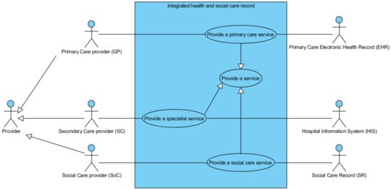 This section describes a case study taken as an example for the design and implementation of an integrated health record system (longitudinal electronic health record). It comprises the access of both health and social care services and thus requires access to the electronic health record (EHR) as well as to external health care systems and social care records. In particular, the case study is centred on the data collection perspective with the aim of designing an interoperable integrated system. It specifically describes a real situation where a patient with limited self-sufficiency requires access to multiple services to monitor his/her daily life and to define specific therapeutic and social assistance plans. However, the integration of data from heterogeneous systems raises the question of identifying a design solution that preserves data integrity and confidentiality, i.e., ensures the digital sustainability of what is de facto an autonomous ecosystem. To define the high-level requirements of the system, we adopt the case story methodology [26,27]: M. P., 75 years old, female, partially self-sufficient following a cerebral ischemia and obesity. She lives alone. She is followed and checked periodically by medical staff (e.g., general practitioner and a specialist control centre made up of a cardiologist, neurologist, dietician, etc.) as well as by social workers that provide services to support her daily life needs (e.g., house cleaning, shopping, bill payment, social life). The patient’s clinical and social information is stored in several distinct databases: general practitioner medical record, specialist medical records, electronic health record within the hospital, and social record managed by social services at a municipality level. The main aim of the integrated system is to provide a suitable solution to collect data from these systems and to show them to patient and providers according to their specific profile. The scenario described above is summarized in Figure 2, using the UML use case diagram that highlights actors involved in the care of a patient with complex care needs, as well as the information systems accessed by these actors during the provision of health and social care services. In particular, each actor provides a specific service to the patient (i.e., primary care, specialist and social care). Data and documents produced during each encounter between the patient and the provider are collected both in the provider specific system and in the integrated electronic health record (IEHR). This record provides to the professionals an interface to the patient’s data depending on their specific role and responsibilities.