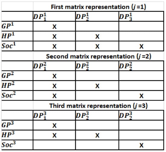Each information system is accessed during the provision of specific services represented here using relevant use cases, which are as follows: Provide a primary care service, Provide a specialist care service, Provide a social service. At this level of abstraction, they represent the functional requirements (FRs) of the system to be designed and implemented. Axiomatic design allows us to associate with each FR a specific implementation method (DP). Considering the case study described above and represented in Figure 2, the axiomatic design approach defines at least three alternative design solutions satisfying the independence axiom. They are shown in the three design matrices reported in Figure 3, where the rows represent the three use cases (GPj = Provide a primary care service, HPj = Provide a specialist care service, Socj = Provide a social service service), and the columns specify the interaction between them (), where j denotes the relevant solution. In this perspective, if the use case placed in column i interacts with the use case placed in column j (through a read and/or write action) the correspondence cell is flagged by the symbol “X” [25]. It is important to note that each actor may access and modify only the system he/she is in charge with, while other systems may be read depending on the type of data [28]. If the actor is allowed to read relevant-privacy data from other systems, then the corresponding cell is flagged, otherwise it remains empty.
