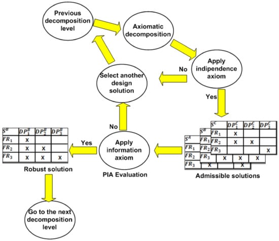 - At the “Select another design solution” step, the robust solution of the previous level is replaced by another solution of the same level. This condition occurs if none of the decomposed solutions satisfies the independence axiom or if the impact assessment of the identified admissible solutions is not deemed acceptable.