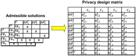 Based on these assumptions, we can proceed to enhance the elements of the privacy constraint matrix (see Figure 5). The design solution corresponding to the design matrix that has the lowest overall value is selected. This assessment could also involve the redefinition of the functional requirements of the system in case no previously defined design solution has an acceptable value with respect to design constraints [25,35]. However, this does not pose any problem because axiomatic design is an iterative methodology, conceived to allow the reformulation of functional requirements or design constraints.