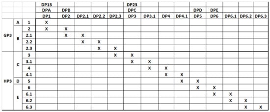 Figure 6 represents the logical design of the GP3–HP3 subsystem in matrix form. The GP3 and HP3 use cases have been decomposed into gradually more elementary actions. The elements of the rows are the use cases of the system and the actions obtained for functional decomposition as reported in Table 6. These actions are activated for the use case GP3 by the general practitioner, while they are activated by the medical specialist for the use case HP3. The cells of the matrix are marked with symbol X if the use case indicated on the column axis is able to activate a process capable of modifying the state of the target use case [19]. As can be seen, the design matrix in Figure 6 is constructed on an empirical basis, interpreting the description of end-user desires [23,26]. Our design process is iterative in nature [14]. Therefore, as a starting point, this solution can be considered valid because it respects the independence axiom since the related design matrix is triangular. With subsequent iterations, following the scheme summarized in Figure 4, we can proceed to improve the conceptual design of the system as well. However, the phenomenon related to sequential coupling will always remain. This is due to the fact that the activation of the use case FRi+1 always depends on the previous FRi. This is a structural type situation [36]. On the other hand, this type of sequential coupling can be neglected because the relationship between FR-DP is a decoupled type.