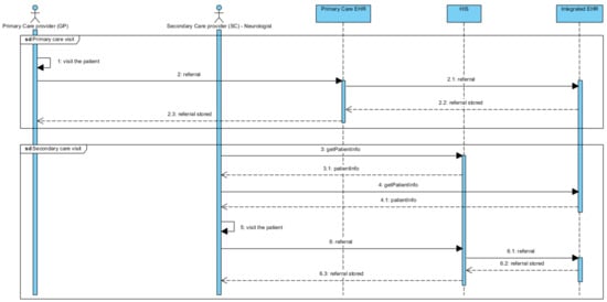 Starting with the design solution associated with the design matrix j = 3, we can carry out additional functional decompositions. For each of these decompositions, we apply the PIA approach introduced in the previous section. Axiomatic design also allows us to break down the design artefact into interconnected modules. It allows us to decompose a complex project into autonomous modules to be entrusted to design teams with specific specializations, which can operate remotely and with timescales established by a rigid schedule. Axiomatic design allows it to keep track of successive decompositions [19]. It permits coordination of design even in contexts of high operational complexity. In our case, for simplicity of exposition, we limited the decomposition to the mapping between the general practitioner and medical specialist (e.g., neurologist). In practice, we have defined in terms of a design matrix and UML diagrams the use cases relative to the visit of the patient by the general practitioner (GP3) and the medical specialist (HP3). The functional decomposition of the use cases was pushed to the point of defining the logical design of the GP3–HP3 subsystem. Table 6 provides a summary for three consecutive functional decompositions.