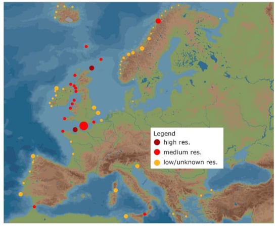A considerable number of known locations having low to high hydrokinetic power potential are in Europe. Medium to high potential locations for tidal power plants development are situated in the United Kingdom [5], France [3], at the Strait of Gibraltar [6], and the Strait of Messina [7,8]. Furthermore, it is expected that several more hotspots having lower and unknown potential exist throughout the continent. As illustrated in Figure 1—which is adapted and extended based on information from [9]—for lower and unknown hydrokinetic potential sites, limited information exists. Therefore, there is a need for accurate investigation of the hydrokinetic resource for discovering new power production opportunities at the mentioned places. As initially mentioned, for assessing the hydrokinetic annual energy resource accurately, not only the tidal phenomenon needs to be considered, but also a series of key factors, for instance the freshwater flow or local effects, need to be incorporated within a numerical study, which can be used to assess the resource. Due to the complexity in setting up numerical models and the difficulties in data acquisition for each of the potential regions, it would be rather difficult to have a precise quantification of the available resource considering large geographical regions. Additionally, the variability of the hydrokinetic flow must somehow be assessed for well predicting the net annual harvestable hydrokinetic power [10]. Each area needs to be studied individually and a robust methodology for facilitating the analysis is required. By applying existing standards, a good tidal characterization can be obtained, although, for regions where other effects apart from the tidal flow exist, all stages of procedures should be applied for obtaining consistent results [11,12]. In the case of small to medium-size projects, such an option might not be suitable for a preliminary investigation of the exploitable energy resource.