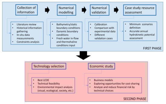 For assessing the hydrokinetic power potential of a region of interest, the procedure indicated in Figure 2 (first phase) can be applied. The major steps of the method are: (i) collection of relevant information, (ii) numerical modelling, (iii) numerical validation, and (iv) case study resource assessment. Successively, a second phase can be implemented that focuses on technology selection and detailed economic assessments. For conciseness, the present paper covers only the first phase.