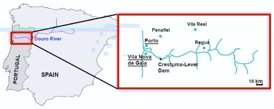 To have a holistic understanding of the case study, it is important to outline the region of interest also taking into consideration diverse features, such as physical, operational, and climatic characteristics. For instance, the Douro River flows from its source in the peaks of the Urbión mountain, in the Spanish province of Sória, at 2160 m of altitude, to the Atlantic Ocean in Porto. It crosses the North of Portugal in Barca de Alva, stretching around 900 km from its source to its mouth (Foz do Douro) located between the cities of Porto and Vila Nova de Gaia (Figure 3).