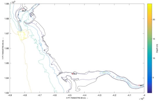 To ensure that the model accuracy is sufficient to realistically solve the hydrodynamic conditions of the region of study, the model was validated against field data of water level variation and flow velocities. The validation period covered from 19 September to 5 October 1994, during which a hydro-morphological campaign was carried out in the Douro Estuary [23,39]. Tidal elevations, currents, among other variables, were sampled at several points, which were distributed horizontally among the region and vertically at three different depth heights. Water level variations were recorded at three stations placed in Cais da Estiva (WL1 in Figure 5), Port of Leixões (WL2 in Figure 5), and Cantareira (WL3 in Figure 5). Table 1 shows the exact location of each station.